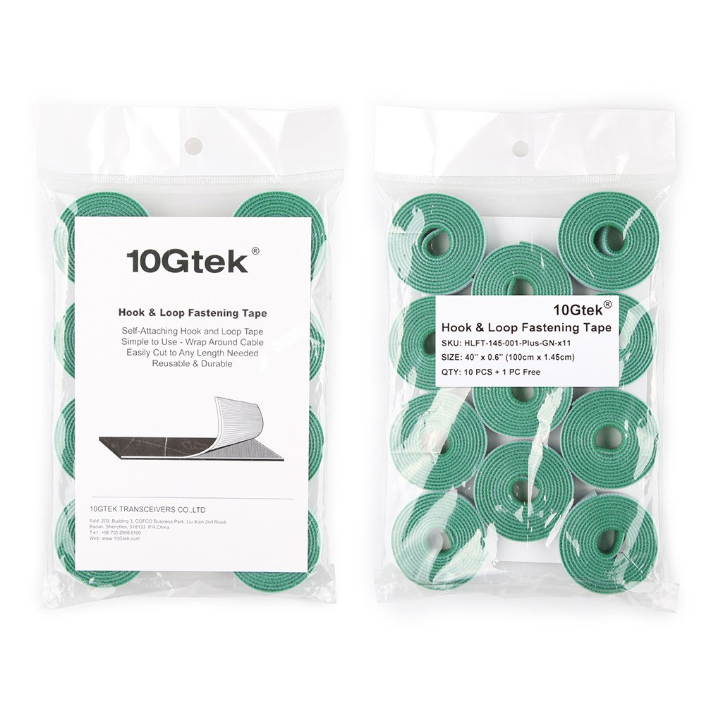 Self-Attaching Reusable Hook & Loop Fastening Tape, Double Side Cable Tie, L 40'' x W 0.6'', 11 PCS #HLFT-145-001-Plus-GN-x11