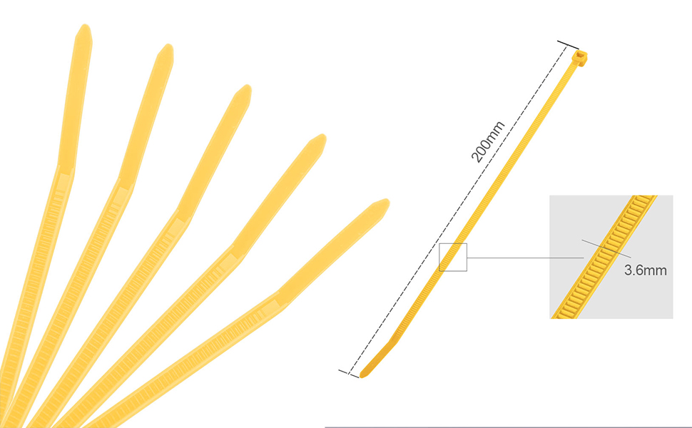 NZT-036-200-YL-5x100, Hifiber nylon zip ties which have locking teeth can be used for tying cables, plants, packages, etc. It's a great tool in home, office, garden and workshop.